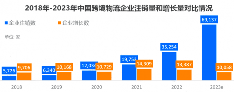 按照探迹大数据研究院的一项演讲数据,2018-2023年,中国跨境物流企业每年新增数量根基不变,而登记数量却日积月累。2023年,中国跨境物流企业新增仅10058家,登记企业却高达69137家。这意味着行业洗牌加剧、并购活跃。